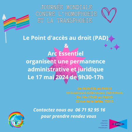 Dans le cadre de la Journée mondiale de lutte contre la transphobie, l’homophobie et la biphobie qui a lieu le 17 mai, la Ville de Paris accueillera l’association Arc Essentiel dans les PAD 13 et 15 afin d’assurer des permanences administratives et juridiques spécifiques sur les discriminations LGBTQIA+.